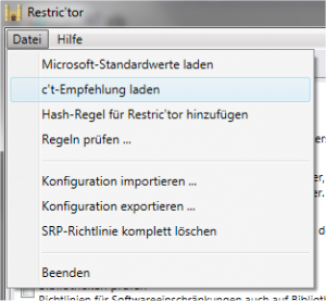 Die c’t Stellt Ihr Tool Restrictor mit dem SRP-Regeln gebaut werden können frei zum Download zur Verfügung. Wirddas Programm dann gestartet, gliedert sich das ganze (also alle Einstellungen) in zwei Hauptdialoge und ein Datei-Menü.