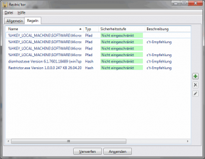 Im Dialog für die Regeln sind hier exemplarisch die c’r Regeln aufgeführt. Wie zu ‚ahnen‘ ist umfassen diese die Programm-Verzeichnisse für 32 und 64-Bit Software sowie die Windows Systemverzeichnisse. Zudem ist auch explizit das Restrictor-Programm erlaubt – denn es wäre ungünstig wenn dieses nicht mehr gestartet werden könnte um die Regeln zu bearbeiten 🙂