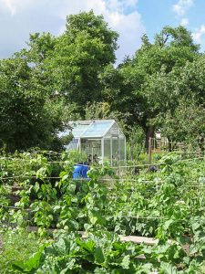 Mein Gemüse baue ich in Mischkultur in ca. 1,20 Meter breiten Beeten an. Ich achte dabei auf gute Nachbarpflanzen, wobei es hier unzählige Tabellen und Listen im Internet zu finden gibt. Ein gutes, jedoch etwas anspruchsvolleres Buch zu diesem Thema ist „Mischkultur im Hobbygarten“, was ich durchaus empfehlen kann um sich in das Thema genauer einzulesen.