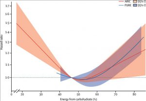 Nun möchte ich den Blick noch einmal auf die oben abgebildete „U-Kurve“ lenken. Diese legt auf den ersten Blick nahe, das ca. 50-55% KH optimal wären – also mit dem geringsten Sterberisiko assoziiert sind. Wer genau schaut, der wird jedoch sehen, das der ‚graue Bereich der Unsicherheit‘ auch in einen Bereich reicht – der durchaus eine noch geringere Sterbewahrscheinlichkeit nahelegt: Bei noch mehr Verzehr von Kohlenhydraten.