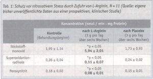 So zeigen nach Michalk Studien, das eine Arginin-Gabe die NO-Werte erhöht und die Peroxinitrid-Konzentration verringert (Poeggler, 2012) [3]. Zum Thema habe ich dann bei Poeggeler [3][4] nachgelesen und fand u.a. die nebenstehende Tabelle. Michalk schlisst mit folgendem Absatz:
