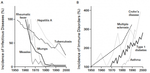 Inverse Beziehung zwischen der Inzidenz prototypischer Infektionskrankheiten (Panel A) und der Inzidenz von Immunstörungen (Panel B) von 1950 bis 2000. Quelle: Bach [11]