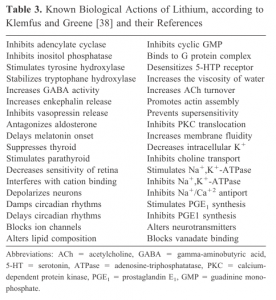 Moduliert wichtige Neurotransmitter (GABA, Serotonin, Dopamin, (Nor-)Adrenalin, etc.), wichtig für B12, wirkt auf BNDF, NGF, senkt wohl die intrazelluläre Calcium (Ca2+) Konzentration, wirkt auf die Tryptophan und Tyrosin-Hydroxilasen ohne die es kein Dopamin gibt! - Deutschland ist ein „Lithium-Mangelland“