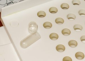 Nun werden die Kappen auf die Kapseln gesteckt – oder gefummelt. Das ist wirklich der nervigste Schritt, weil sich je nach Art und Konsistenz des Pulvers das ganze leichter oder schwieriger gestaltet. Teils lässt sich eine Kappe auch nur schwer aufstecken, so das an der Kappe dann leicht gezogen und damit die Kapsel aus dem Träger herausgezogen wird. Nun ist zumindest das Aufstecken der Kappe einfacher 🙂