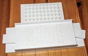 Die 100 Kappen können dann in einem Schritt auf die gefüllten Unterteile aufgelegt werden. Mit ordentlich Druck auf die untere Platte, die sich dank der Federn absenkt, werden dann 100 Kapseln auf einmal ‚verkappt‘. Das Funktioniert bei mir mit guter Kapselqualität 1a – faktisch ohne Ausschuss. Damit befülle ich inzwischen in ca. 10 Minuten 100 Kapsel, wenn Kapsel-Kappen und Unterteile getrennt vorliegen.