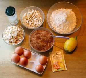 - Das Mehl + Mandeln in die Rührschüssel geben.