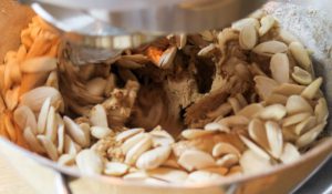 - Mandeln – diese wässere ich für ca. 12 Stunden, wodurch unerwünschte Antinährstoffe abgebaut werden. Danach werden die Mandeln enthäutet und wieder 12-24 h bei 60 Grad getrocknet – wozu ich ein Dörrgerät verwende.