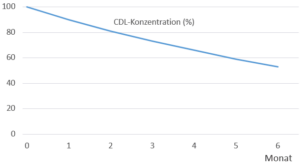Auch CDL zerfällt. Wenn es dicht im Kühlschrank gelagert wird – dunkel – dann ist der Verfall geringer, je geringer die Lagerungstemperatur ist und desto kleiner die Luft im Gefäß oder der Flasche ist. Grundsätzlich sollte mit einer Abnahme der Konzentration um bis zu 10% pro Monat gerechnet werden, so das nach 6 Monaten nur noch ca. 50% der 3000 ppm-Lösung ‚übrig‘ sein könnten.