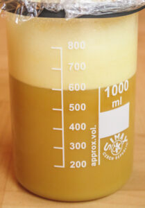 Wichtig: Sollte es keine klare Separierung geben, dann wurde in der Regel die Lösung beim ersten Mix-Vorgang nicht lange genug auf 50 Grad C erwärmt worden und ist dadurch nicht entsprechend emulgiert. Dem ist jetzt nicht mehr abzuhelfen – außer zu versuchen noch mal auf 50 Grad zu mixen, die Temperatur dort zu halten, alles wieder kühl zu stellen….