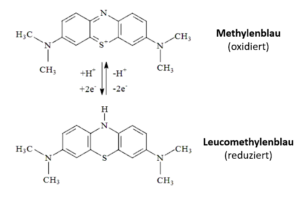 - Reduziertes Methylenblau (bekommt ein Elektron von einem Spender, z.B. Vitamin C als Ascorbinsäure): Farblos / Transparent.