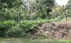 Zu jedem gutem Garten gehört ein Kompost. Und ein großer Garten braucht einen „Chaos-Kompost“, wo Wurzeln von Bäumen, nicht schredderbares, schlecht kompostierbares, aussamende Beikräuter & Co. hin können. Unser Chaos-Kompost hat sicher schon ein Volumen von >> 40 m³ rein organischer „Abfälle“, da das Gelände nach der Übernahme erst einmal aufgeräumt und entmüllt werden musste. Alles was an Holz und Ästen schreddebar ist, verarbeite ich jedoch mit einem 13 PS-Schredder zu Mulchmaterial für Wege und Beete.