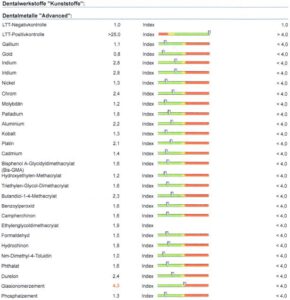 Allerdings ist es nicht immer ganz so einfach! So ergibt sich z.B. bei einer Titanunverträglichkeit KEINE lyphozytäre Reaktion [10]. Insofern verwendet das IMD Berlin (sowie Biovis) hier einen sogenannten Provokationstest mit Zytokinfreisetzung (-> TNF-alpha) von Makrophagen. Und zu allem unguten kann sich eine Titan-Unverträglichkeit auch noch NACH Implantation zu einem späteren Zeitpunkt entwickeln – wie auch bei anderen Substanzen. Insofern bin ich mit LLT-Tests (u.a. nebenstehend als Bild) vorsichtig.