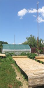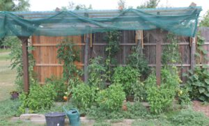 Gut zu sehen ist im Hintergrund, dass wir auch unser Folien-GWH beschatten – zumindest in die Südrichtung. Zudem können wir die Seiten des GWH hochrollen und haben im Sommer Türen mit Vogelschutz-Netz eingesetzt, so das auch da der Wind durchziehen kann. Die Türen mit der Folie setzten wir nur bei kaltem Wetter ein.