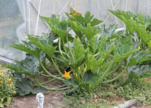 Unsere Zucchini gedeihen gut. Was die Ausbeute verbessert ist alle Blätter abzuschneiden, die auch nur einen „Hauch“ von Mehltau unter den Blättern haben.