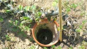 Ganz wichtig für uns: Wir gießen nicht die Erde um Tomaten, Auberginen, Paprika, Melonen, und Zucchini, sondern immer in einen „Gießtopf“. Der Tontopf, meist zw. 18-21 cm, ist der Tontopf in dem wir die Pflanze groß gezogen haben. Beim Pflanzen wird der Topf dann neben die Pflanze eingebuddelt.
