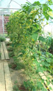 Tomaten mit Überdachung. Offene Seite in Richtung süden. Foto: Mitte Juli.