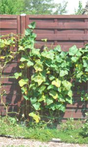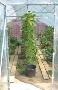 Dieses Jahr haben wir Gurken in der Mitte des GWH angebaut. Dazu wurde eine Rankhilfe benutzt – ein Netz mit sehr weiten Maschen, ca. 8-10 * 8-10 cm.