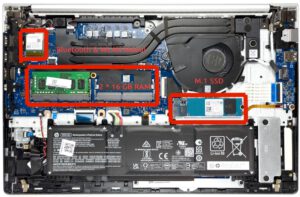 Das Umbauen der M.2 SSD geht einfach: Ein paar Schrauben vom unteren Deckel entfernen, Plastedeckel abnehmen und die SSD, welche mit einer Schraube befestigt ist, austauschen. Im gleichen Zuge kann das WLAN/Bluetooth PCI-Modul entfernt werden. Dazu werden die beiden Antennenstecker mit einer Pinzette vorsichtig abgehoben und ggf. einzeln mit etwas Tesaband umwickelt. Danach wird das Modul entfernt. Das geht faktisch genauso bei den meisten Notebooks. Hier gibt es noch ein Video von HP, das alles „in etwa“ zeigt. Allerdings unterscheiden sich die einzelnen Modelle teils stark im inneren Aufbau. Das Prinzip wird in diesem Video jedoch klar.