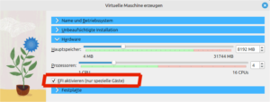 Danach wird VirtualBox gestartet und mit „Neu“ eine neue Konfiguration für ein Virtuelle Maschine angelegt. Die Voreinstellungen sind hier Win10 64-bit, was in den meisten Fällen passt. Wichtig ist bei der Seite „Hardware“ die Option „EFI aktivieren“ anzukreuzen und ggf. mehr als einen Prozessor, sowie genug RAM auszuwählen.
