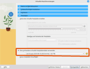 Auf der Seite mit der „Festplatte“ müsst Ihr dann das VHD-Image, welches ihr vorher unter Win10 erstellt habt, einbinden. Dazu sollte diese Datei bei Euch auf dem Linux-System liegen.