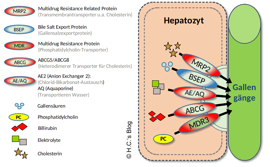 Erst in den Gallengängen bzw. Kanälen werden die einzelnen Bestandteile zur Galle zusammengemischt, in der Gallenblase gespeichert und eingedickt, wobei Wasser entzogen wird. Das, womit die Bestandteile „exportiert“ werden, nennt sich Transporter, Pumpe und Ionen-Austauscher. Hier die wichtigsten für die Komponenten der Galle, wobei ich mich auf die primären (-> wichtigsten) Transporter beschränke: [1][11]