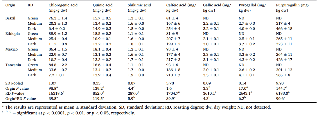 Konzentration von Chlorogensäure, Chinasäure, Shikimisäure, Kaffeesäure, Gallussäure, Pyrogallol und Purpurogallin in grünen und gerösteten Kaffeebohnen unterschiedlicher Röstgrade und geografischer Herkunft. Lizenz: CC BY 4.0, Quelle: [21]